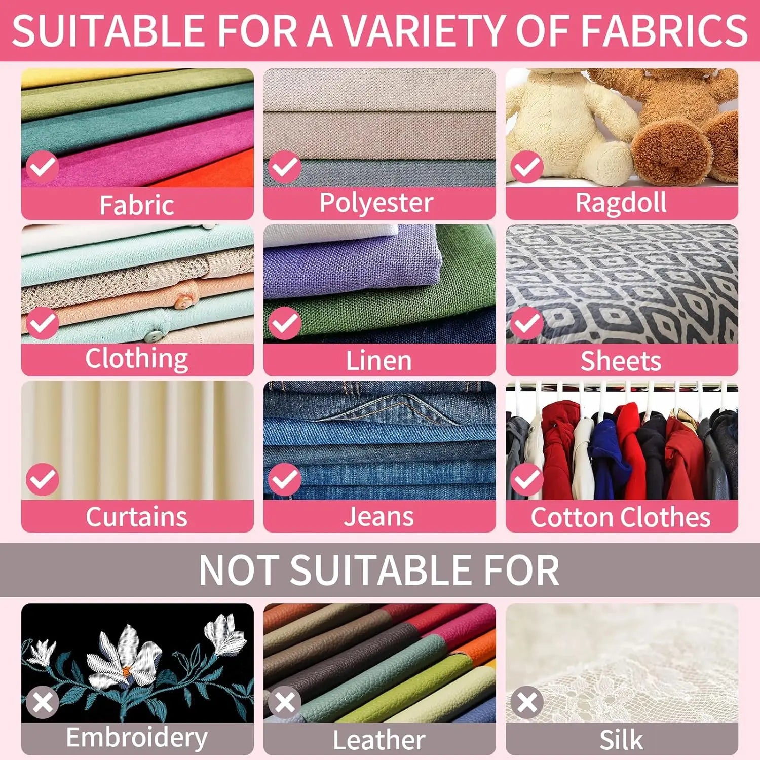 Fabric safety and versatile; Clothing label tools are perfect for solid fabrics such as linen and denim. Note: It is not recommended to use exquisite silk and other exquisite fabrics.